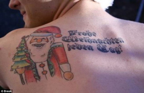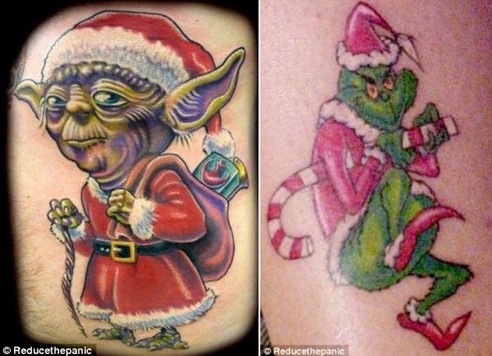 就算是同一主題的聖誕紋身,式樣也各自完全不同。從常見的聖誕樹、聖誕老人紋身到穿著聖誕老人服裝的尤達大師,不少人都用紋身來表達他們的節日態度。更有些人將“天天都是聖誕節”紋在身上。